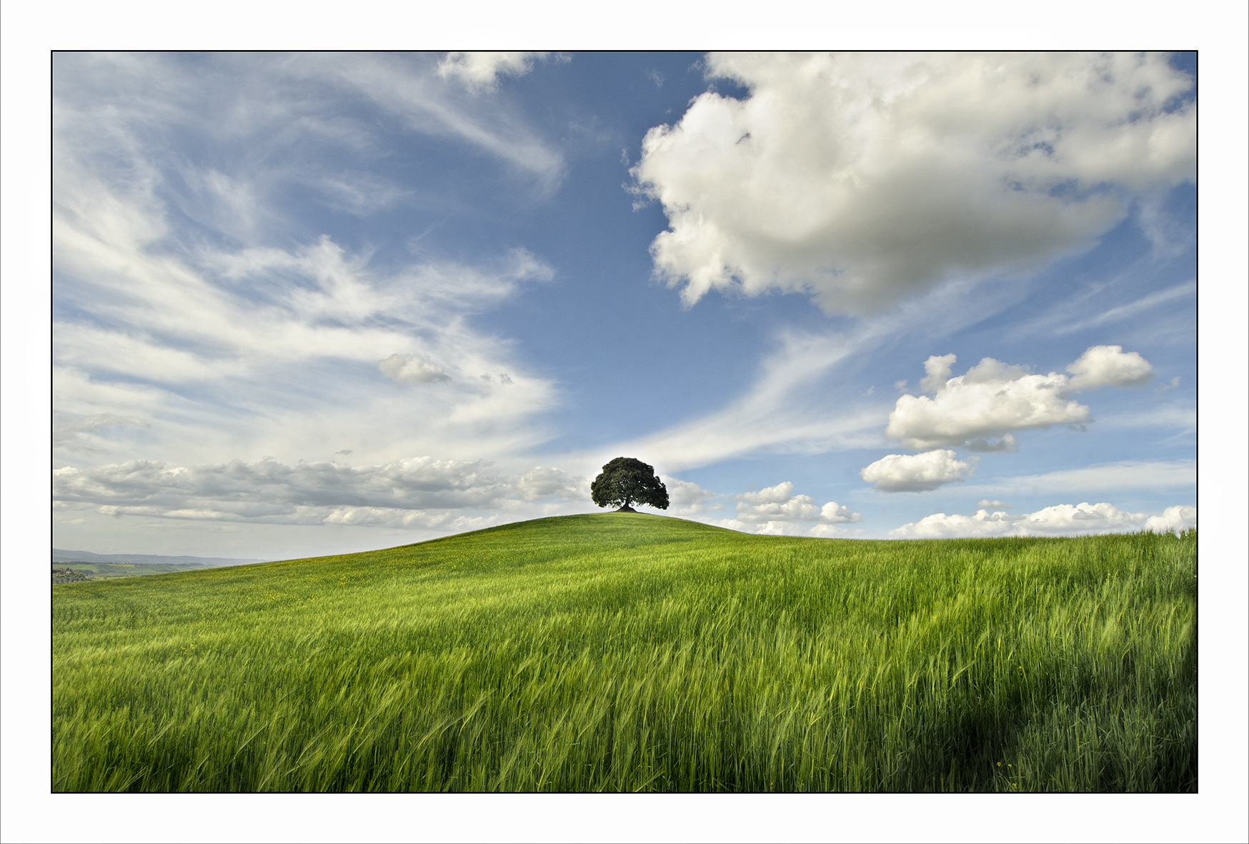Quell'alberello solitario sul cucuzzolo della collina per me fa la foto, poi l'aggiunta delle belle nubi e quel manto erboso hai piedi.. ne valorizzano questa piacevole immagine. Per me ben fatta.