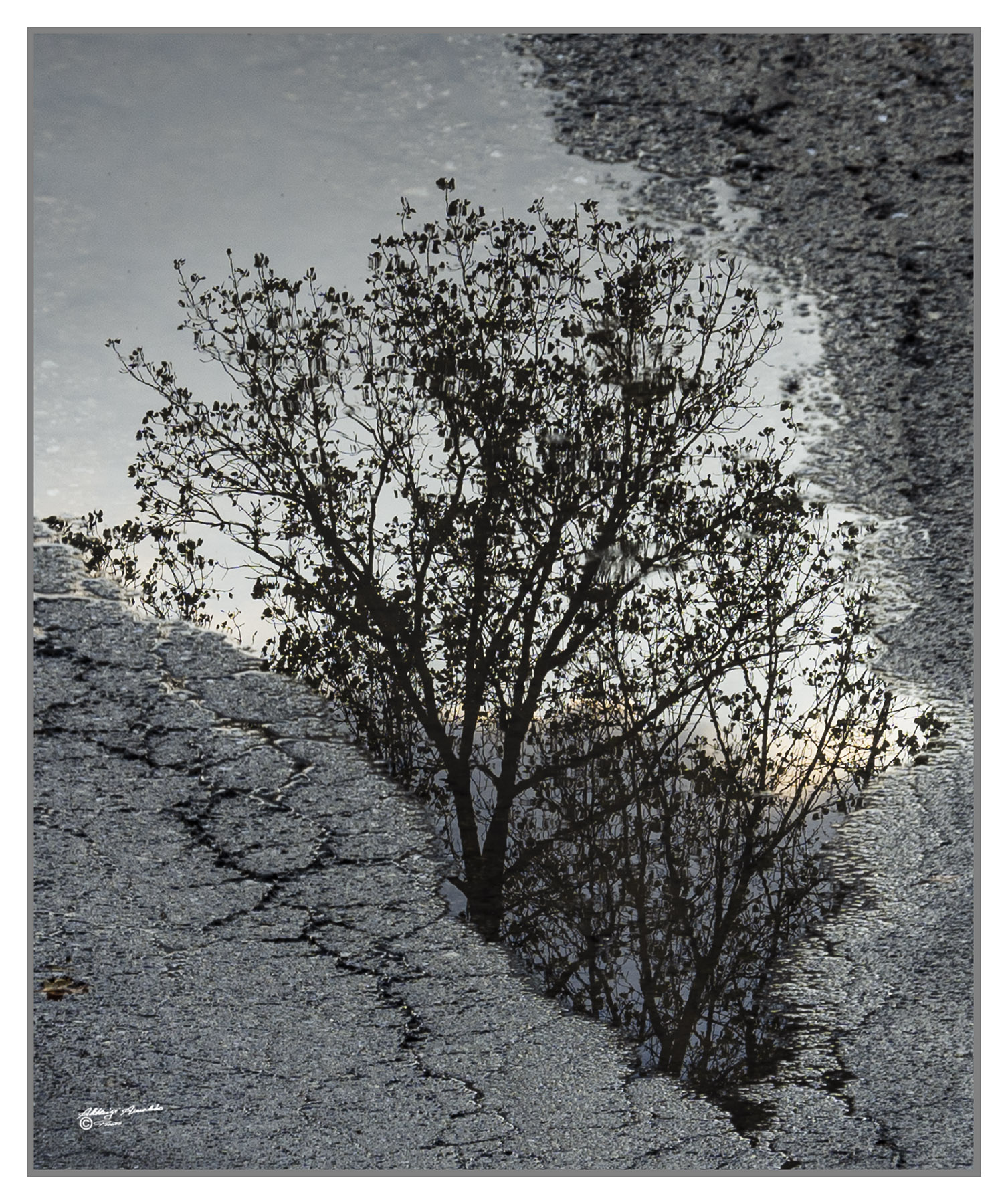 | La miniatura mi ingannava,sembravano rami riflessi dentro un lago parzialmente ghiacciato. Aprendo la foto la cornice argentea, con grande sorpresa ,si è rivelata poi asfalto aggiungendo valore alla particolarità dello scatto. Mi piace. Un saluto, guido |