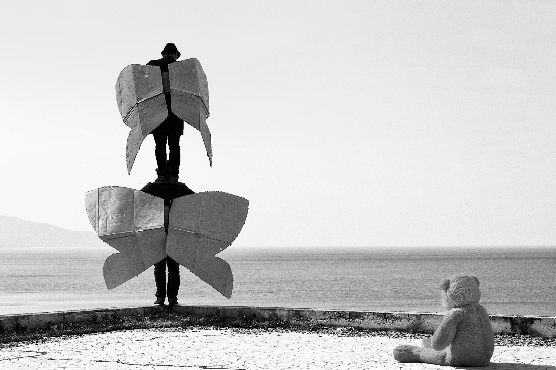 L' uomo sogna di volare.. e non si accontenta mai .. ci prova con ogni mezzo,sempre più in alto,... Convince anche l'io pauroso che forse provare si può,sfida se stesso, i suoi limiti, l altezza, perfino i consigli saggi del suo compagno di una vita che sta fermo a guardare.. pronto ad esser lì a gioire con lui e condividere sogno e risultati,ma anche pronto ad offrire quel conforto sicuro in cui rifugiarsi,puri come bimbi impauriti,se quei sogni si infrangeranno , se non si potranno raggiungere, o anche solo se ad un certo punto si capirà che non vale la pena correre rischi e provarci, mollare il sicuro per illusioni che chissà dove portano ..