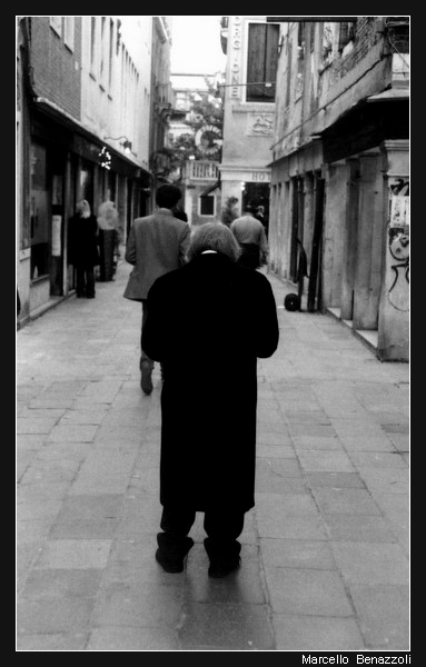 il signore è anziano e fermo, davanti c'è un giovane ben vestito che procede con passo spedito.. nessuno guarda il signore, come se non esistesse...