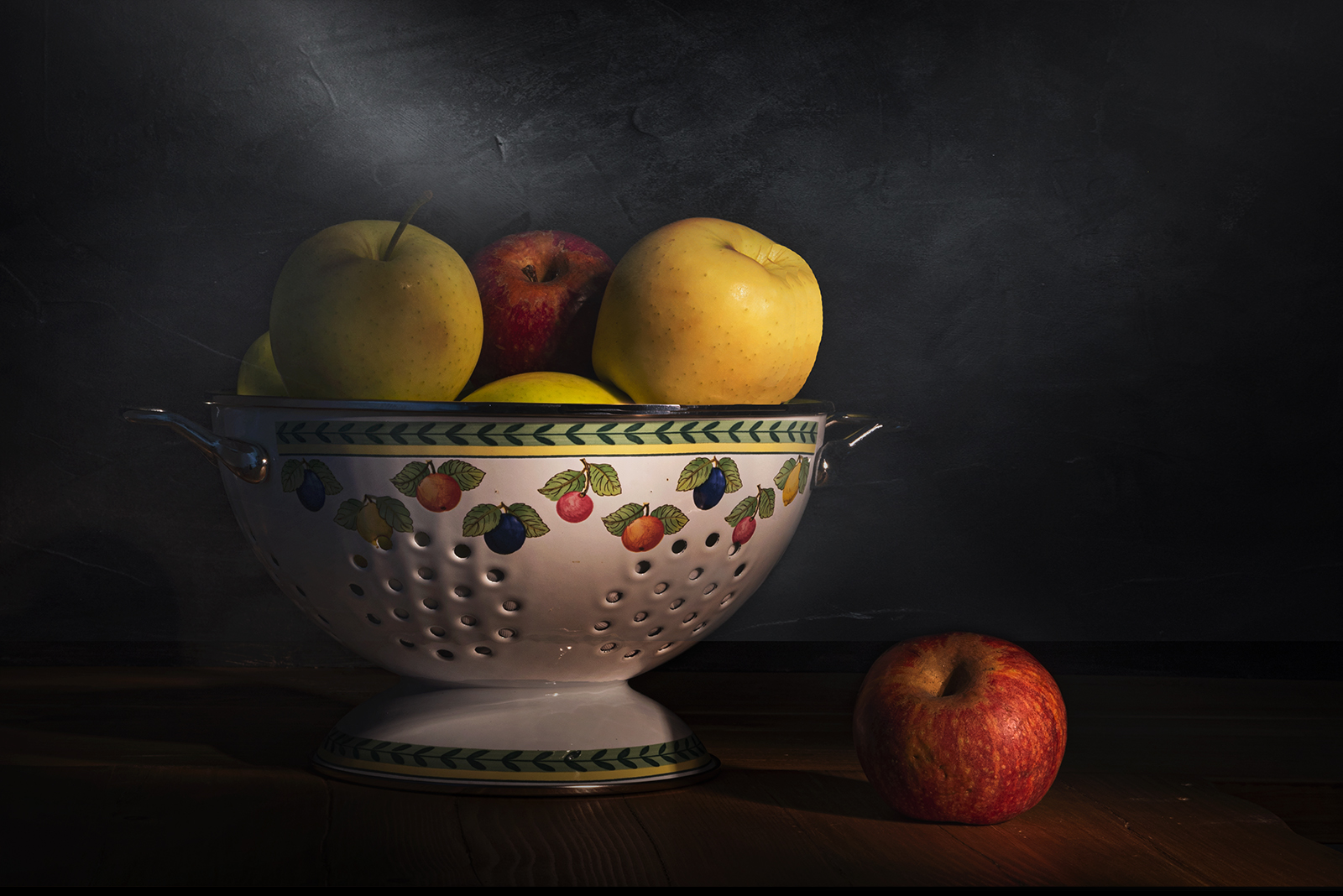 forse ci sarebbe voluto un qualcosa per rompere l'ombra profonda a destra dietro la mela, perché i due protagonisti proprio perché due e di dimensioni diverse chiamano un terzo "incomodo" che alleggerisca senza attirare l'attenzione. Uno straccio bianco, qualcosa appoggiato .
