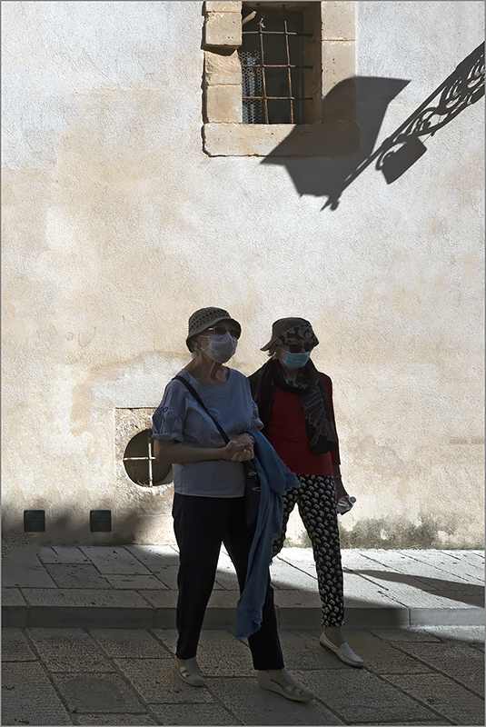 Quell'elemento che fa ombra sembra quasi un profilo stilizzato con lo stesso cappellino delle due signore, oppure una curiosa telecamera che scruta l'osservanza dell'obbligo delle mascherine. Il ritmo a passo di danza dona un tocco in più  _________________ - Fotografo della domenica |