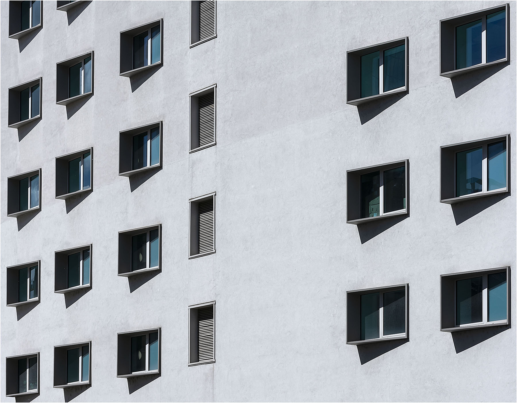 Punto di ripresa anomalo ed ombre sbilenche fanno prendere una piega anarchica all'ordinato pattern di finestre.Situazione non facile che sei riuscito a trenere sotto controllo con un precisa tenuta in asse ed interessante composizione. Ciao,Sergio.