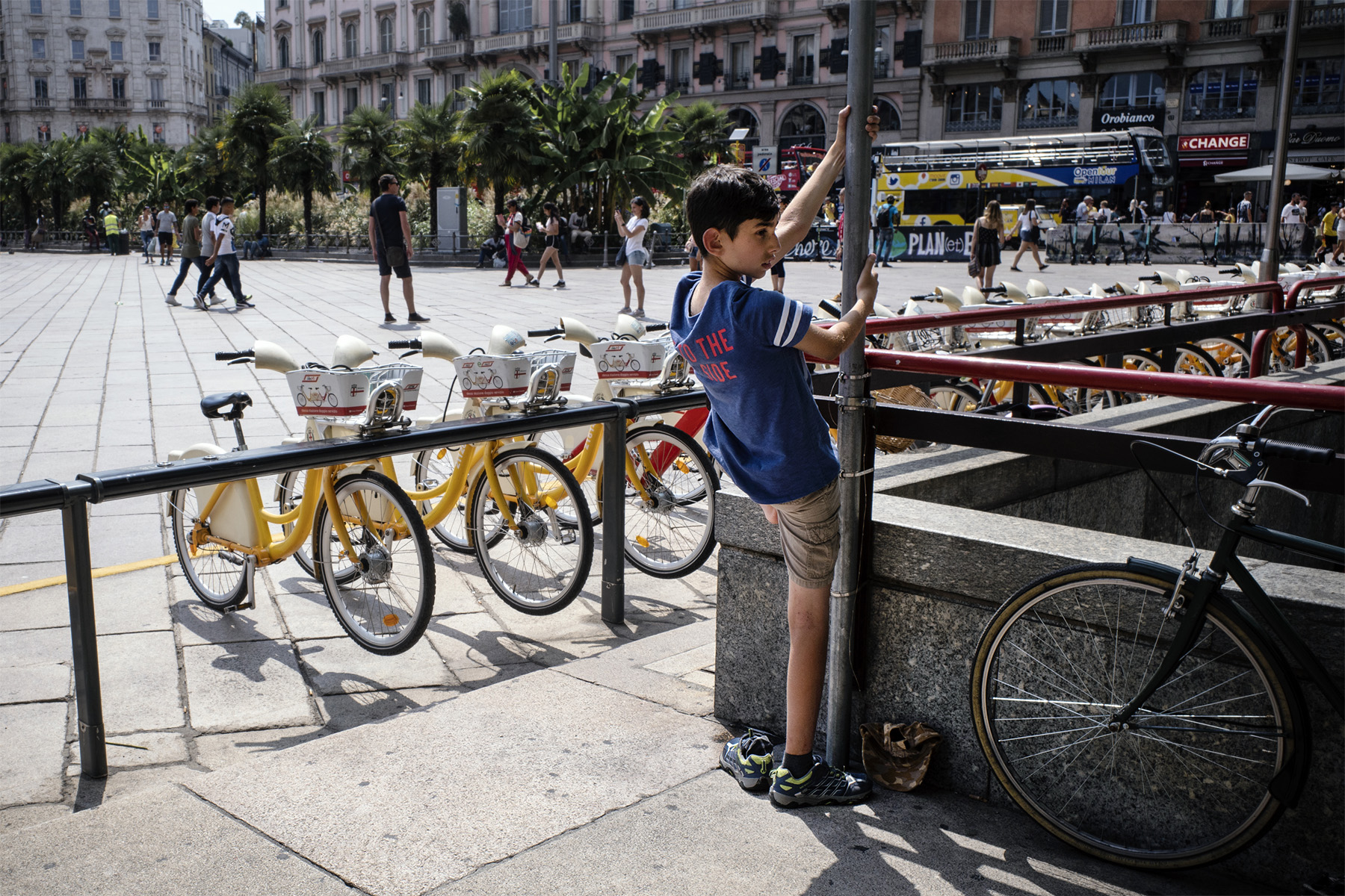 E' anche un bambino anticonformista dal momento che guarda l'unica bici che cromaticamente si distingue dalle altre.