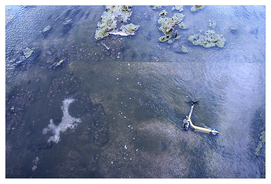 È solo il monopattino a dare il senso della realtà a questa immagine altrimenti completamente astratta… Il viraggio azzurro, in effetti, la assimila a un cielo, con la schiuma a fare da nuvoletta… e allora il monopattino diventa un sogno, un’astrazione anch’esso.