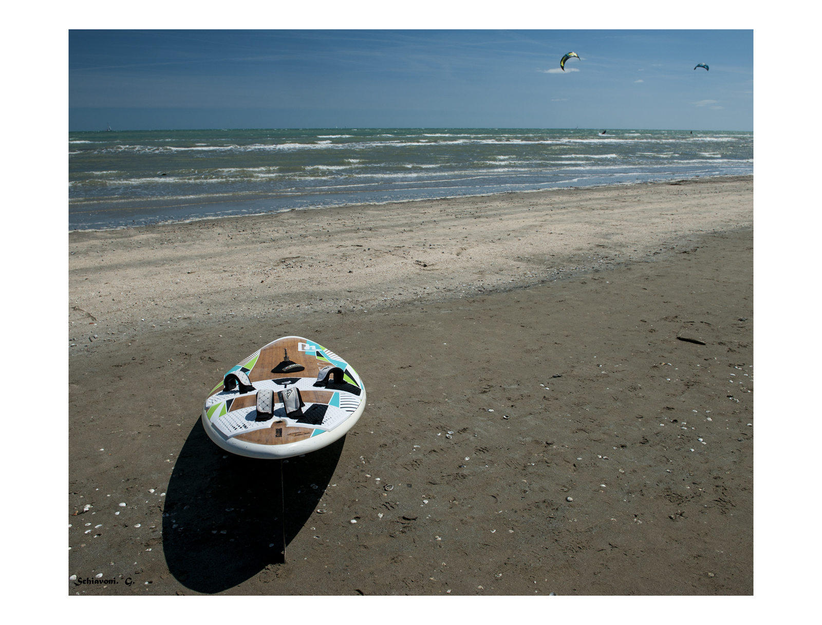 La tavola da surf,in quella particolare posizione e grazie all'aiuto dell'ombra,sembra quasi "uscire" dal fotogramma. Buona la composizione con i punti d'interesse "giocati" sulla diagonale.La luce è stranissima,sembra una di quelle giornate dove c'è una situazione tempesta/sole nel giro di 50 metri. Bella.