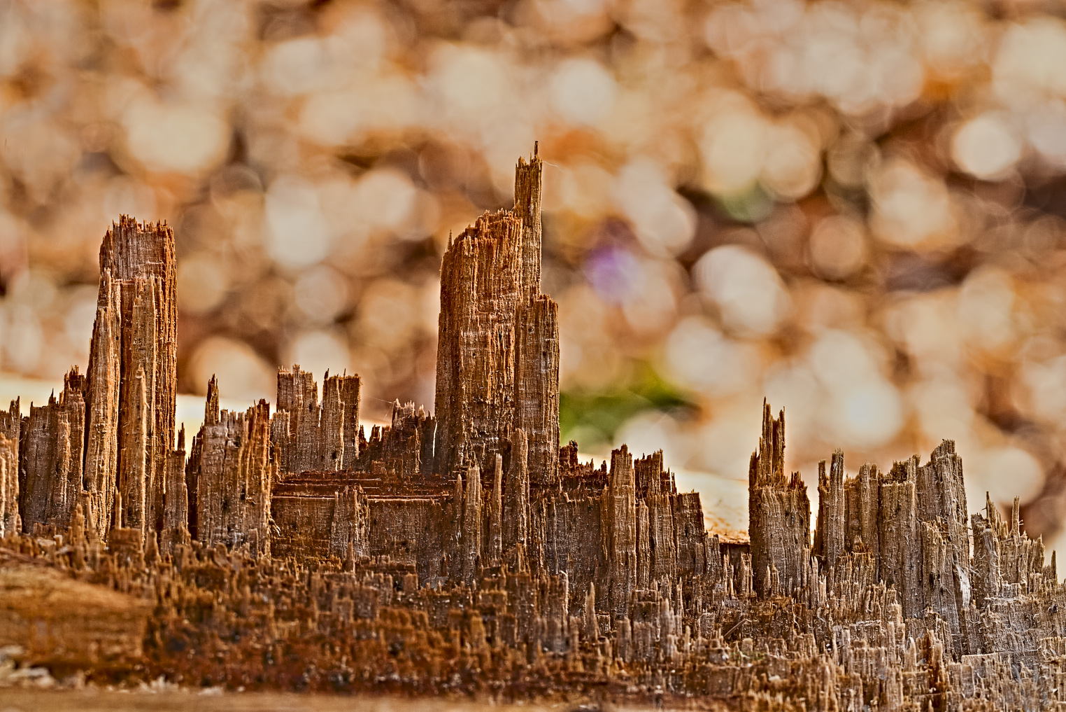 Una sezione a distanza ravvicinata di un tronco di albero reciso che vista così in questa dimensione di proporzioni un po' astratte e dilatate rassomiglia un po' ai cumuli della Monument Valley. Hai avuto un buon occhio e una buona idea, anche ben resa come risultato finale con quel bellissimo sfondo di punti di luce sfuocate a cerchi sovrapposti. bella, bella. Ciao, Tiziano