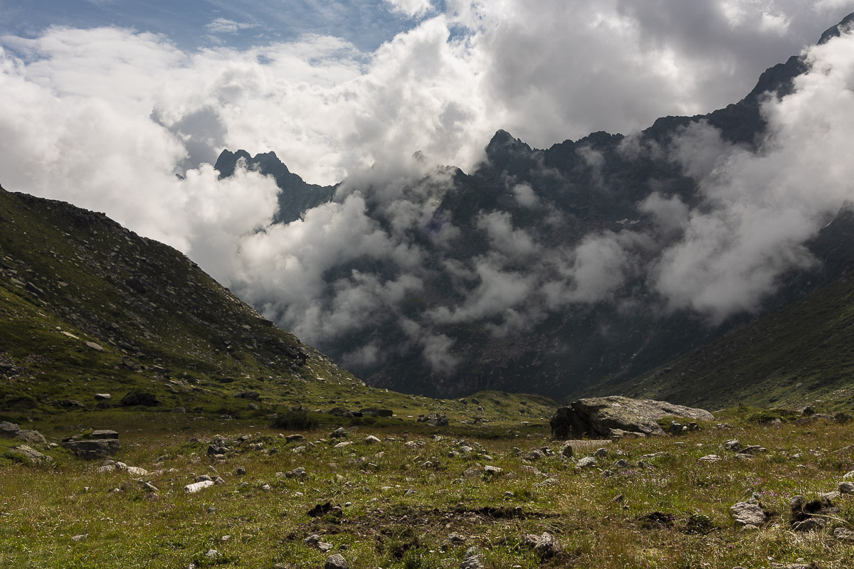 Già il contrasto tra il pianoro verde e lo scuro dell montagne seghettate mi sarebbe piaciuto, se poi ci aggiungi quelle nubi basse e scenografiche il prodotto non può essere che buono