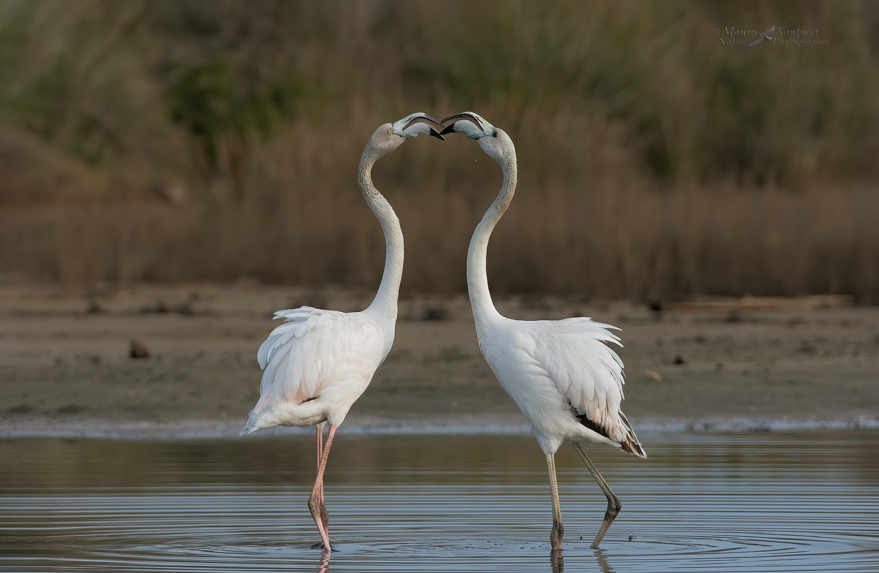 Molto bello il momento colto tra questi due giovani fenicotteri, scatto nitido con buonissima la gestione del bianco.  |