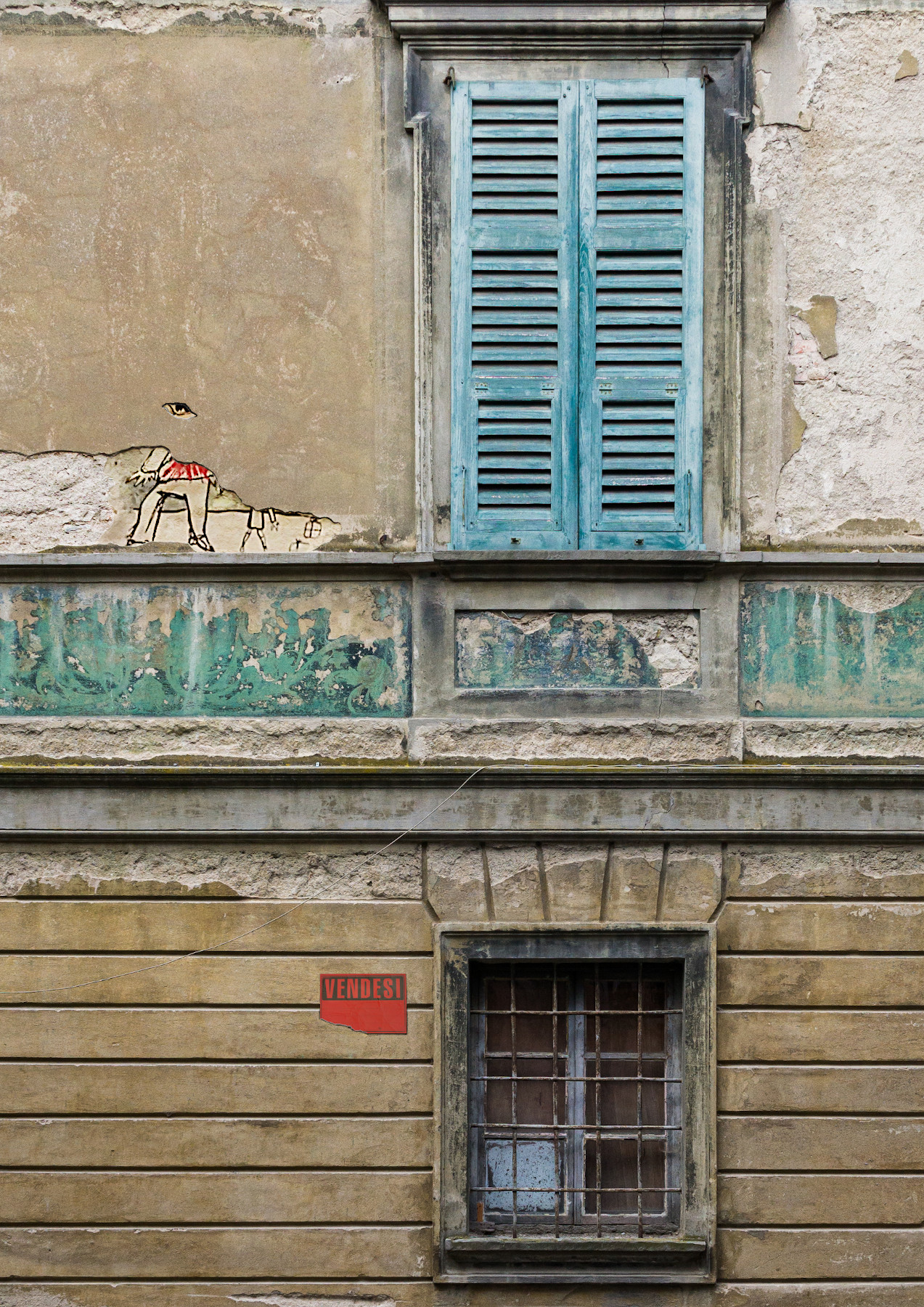 La scena mi piace. Un muro sgarrupato, quella persiana blu mare con bei colori, le due finestre che contrastano, quelle figure sotto l'intonaco che emergono e quel cartello rosso vendesi che spezza l'armonia e racconta una storia dietro la semplice facciata.