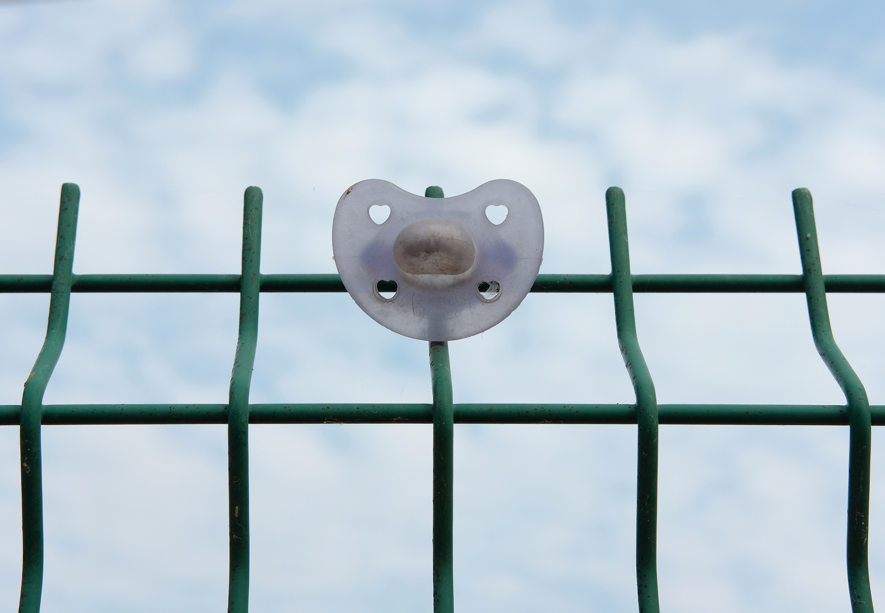 Un ciucciotto per bimbi appeso diligentemente su una recinzione stagliato contro un cielo di candido azzurro e bianco.