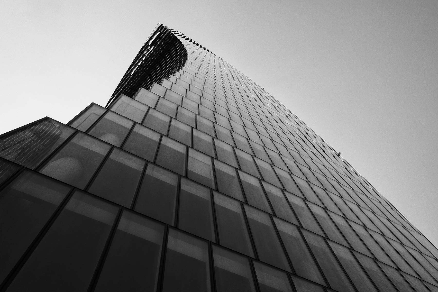 Bella composizione che slancia l’edificio e ne esalta la forma Buono anche il viraggio in bn
