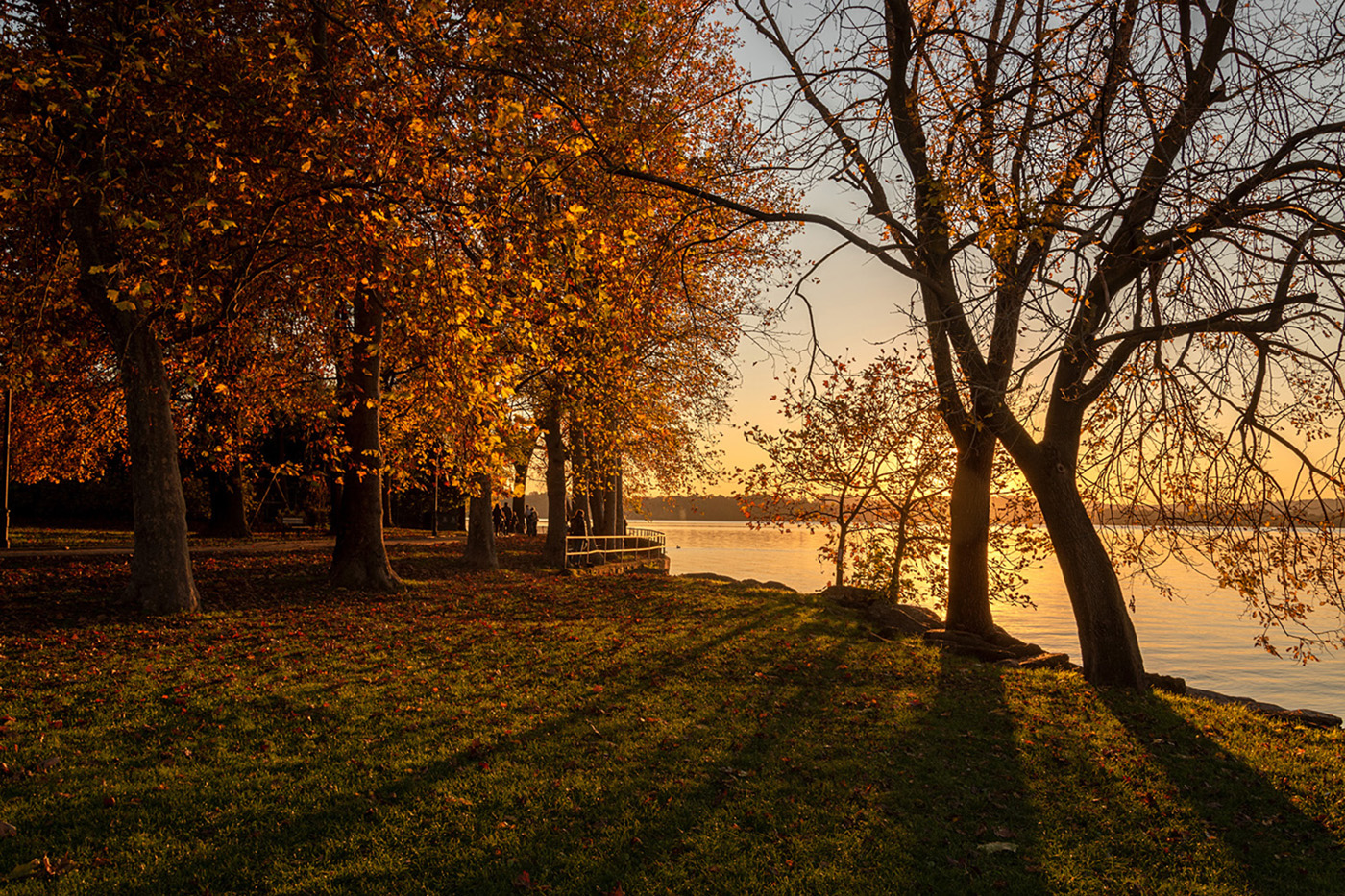 Bella l'inquadratura e questo irraggiamento caldo di luce che proietta le ombre degli alberi sull'erba del prato cosparso di folgie cadute color ruggine.