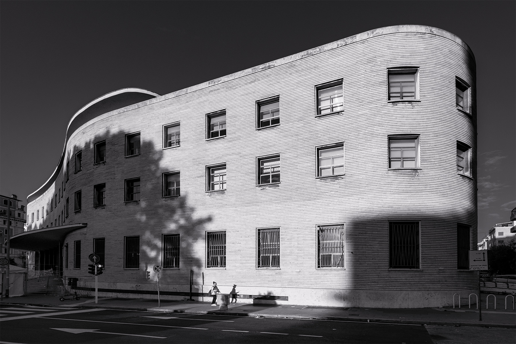 Punto di ripresa che slancia il palazzo, evidenziandone le forme. Bella l'ombra della ragazza proiettata sul muro.