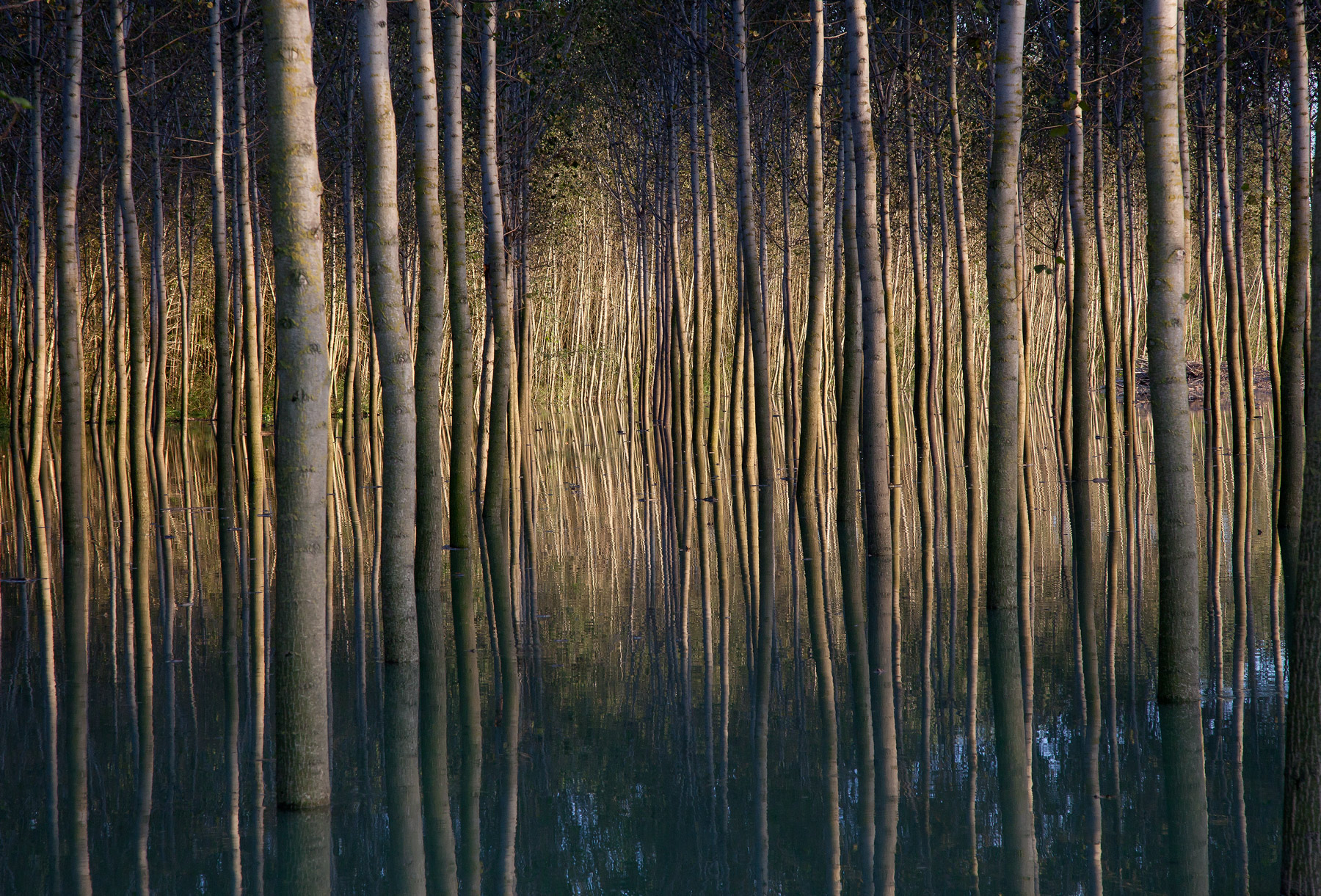Ricordo un particolare di questo luogo, la strada leggermente rialzata costeggiava i pioppi e durante la piena per alcune ore, prima che anche la strada venisse anch'essa sommersa sembrava di trovarsi in una dimensione aliena. Più volte quando l'acqua era a filo dell'asfalto ho rischiato di finire a mollo perchè letteralmente si perdeva sia la cognizione del tempo sia quella di spazio, i riflessi immobili apparivano tanto reali da poterci camminare sopra ed addentrarsi nei lunghi corridoi disegnati dagli alberi riflessi.