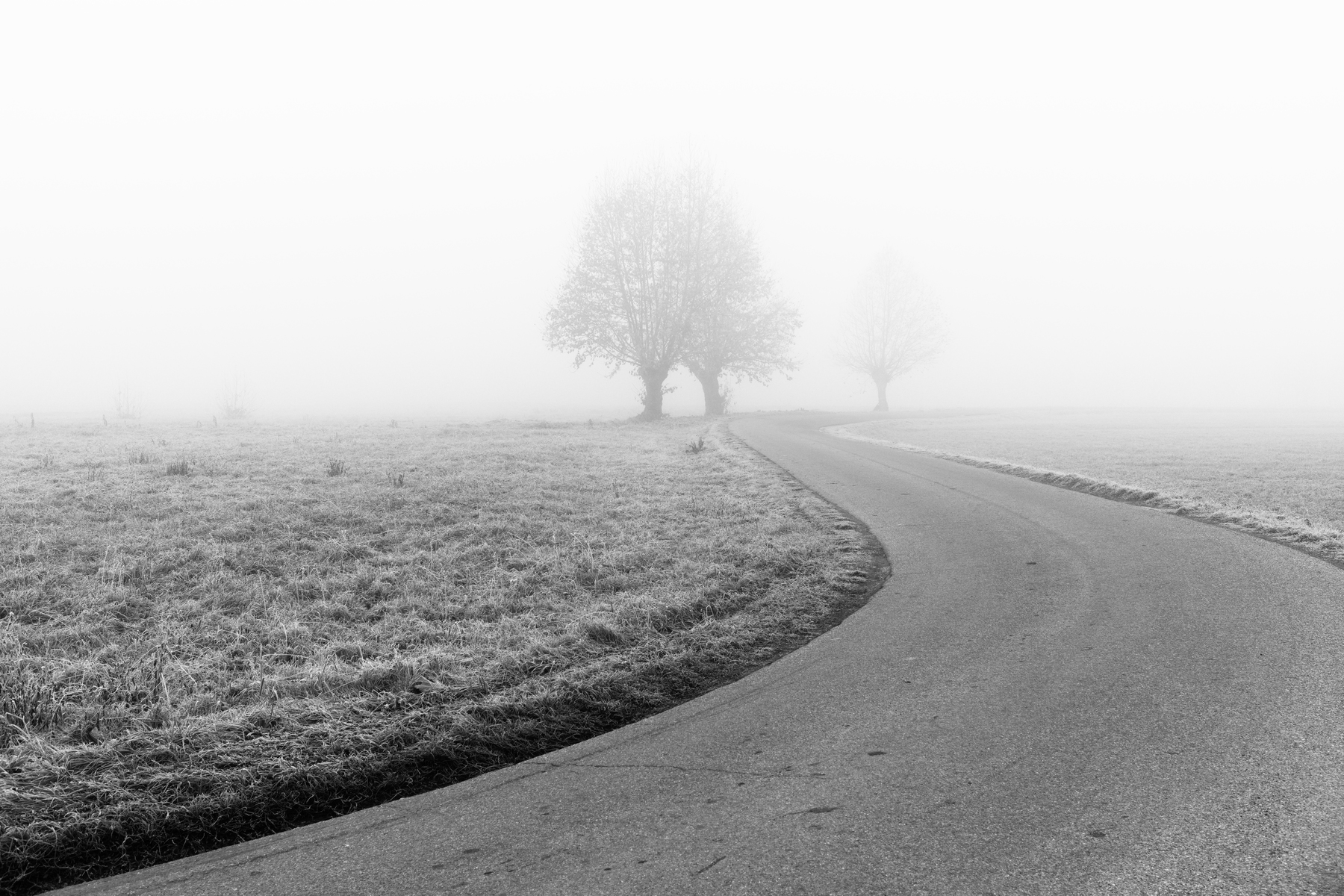 Bella la composizione con la curva che guida verso i tre alberi che si perdono nella foschia. Gelida e dall'atmosfera tipicamente invernale ben resa con un bn adeguato