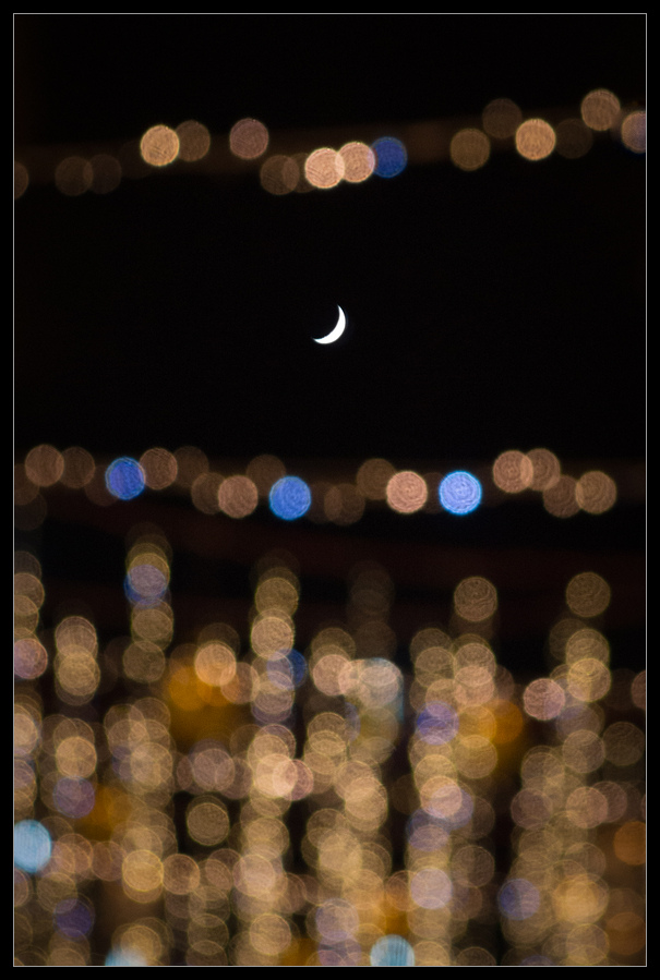 La falcetta di luna, anche se appare leggermente "mossa" fa piacevolmente capolino fra una ghirlanda di lucine sfuocate ed è un'immagine che richiama anche le sensazione Natalizie. Un bel biglietto d'auguri, originale a modo suo.