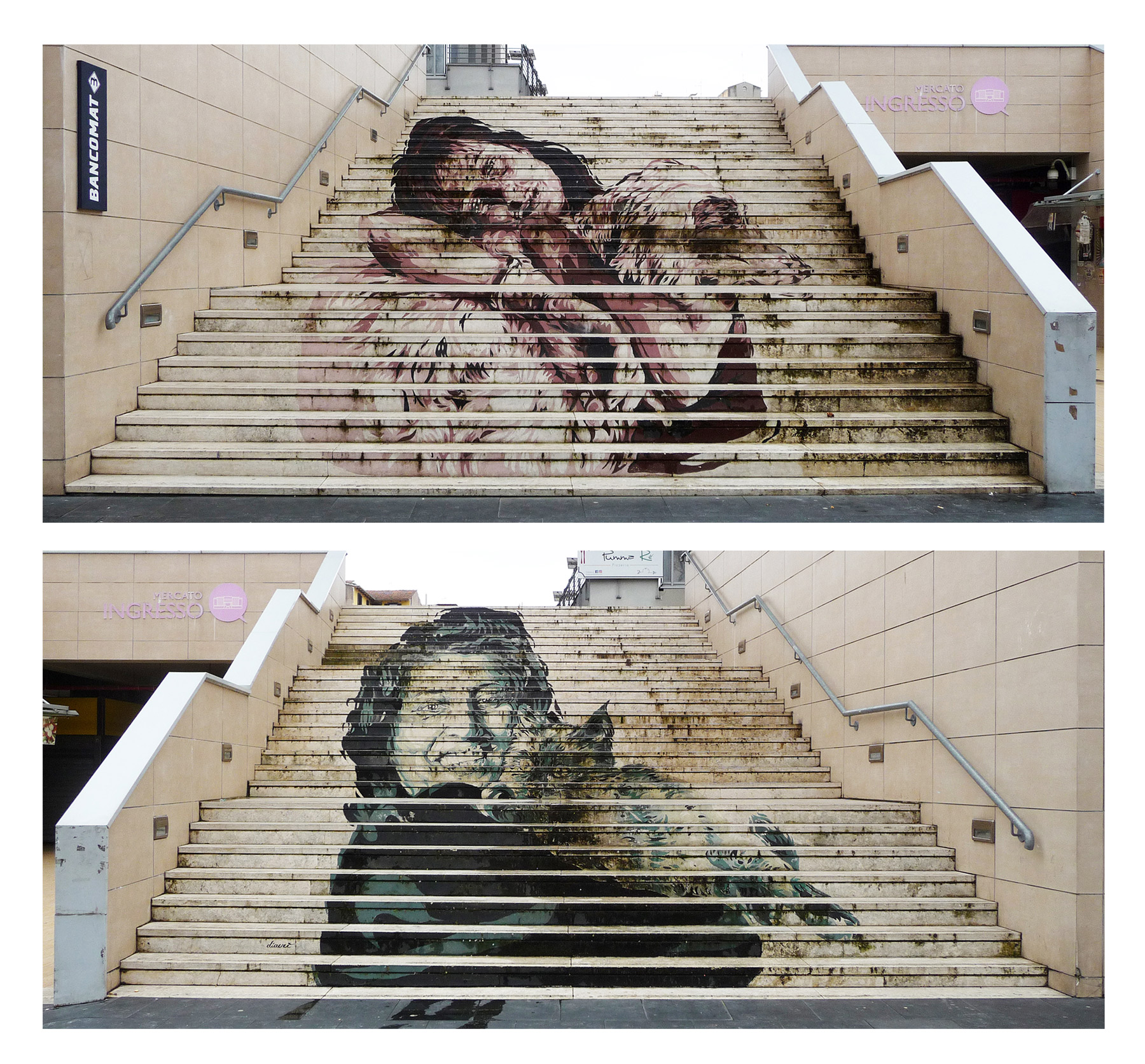 Aspettare che una persona con gatto cammini sul murales con il cane e viceversa, una persona con cane salga le scale con il murales del gatto!