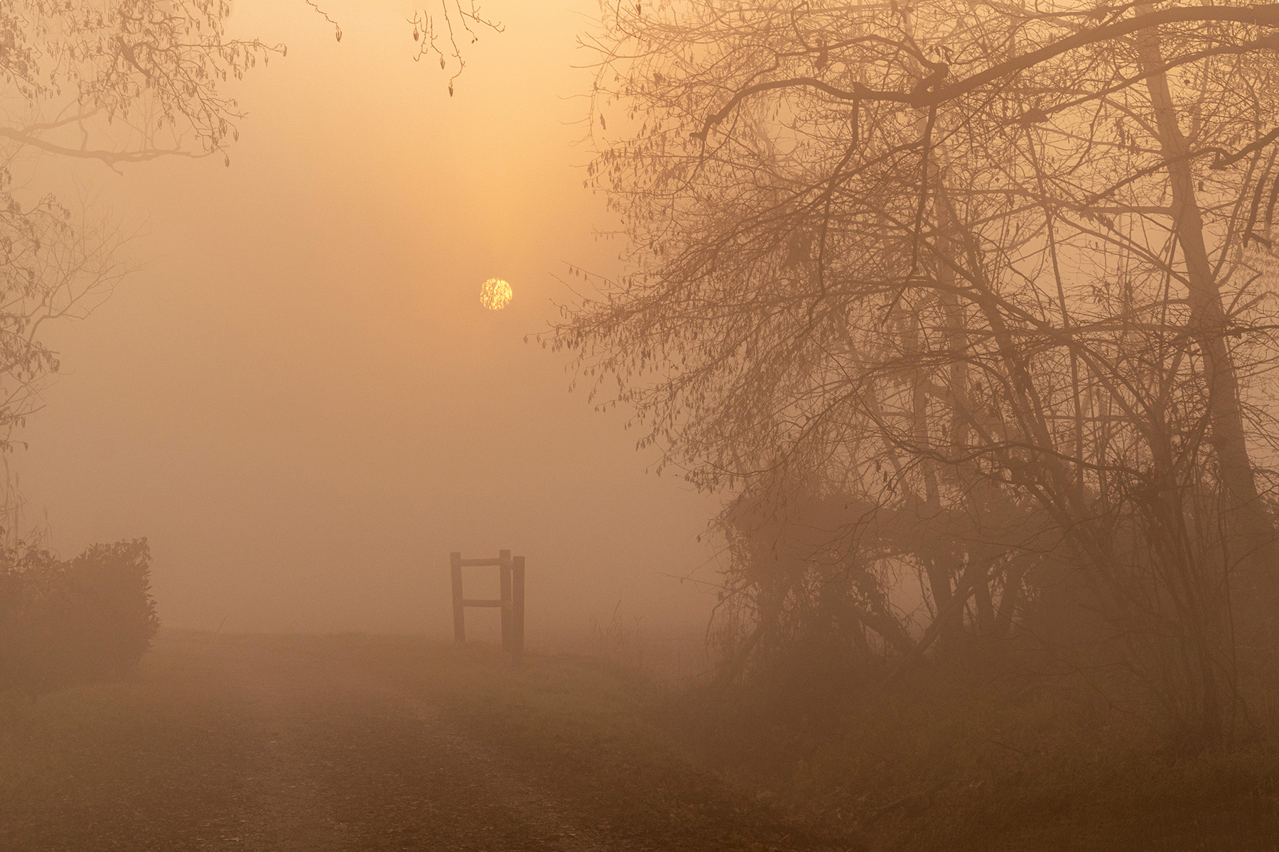 Il disco solare filtra tra le fronde e la foschia che ammanta la scena