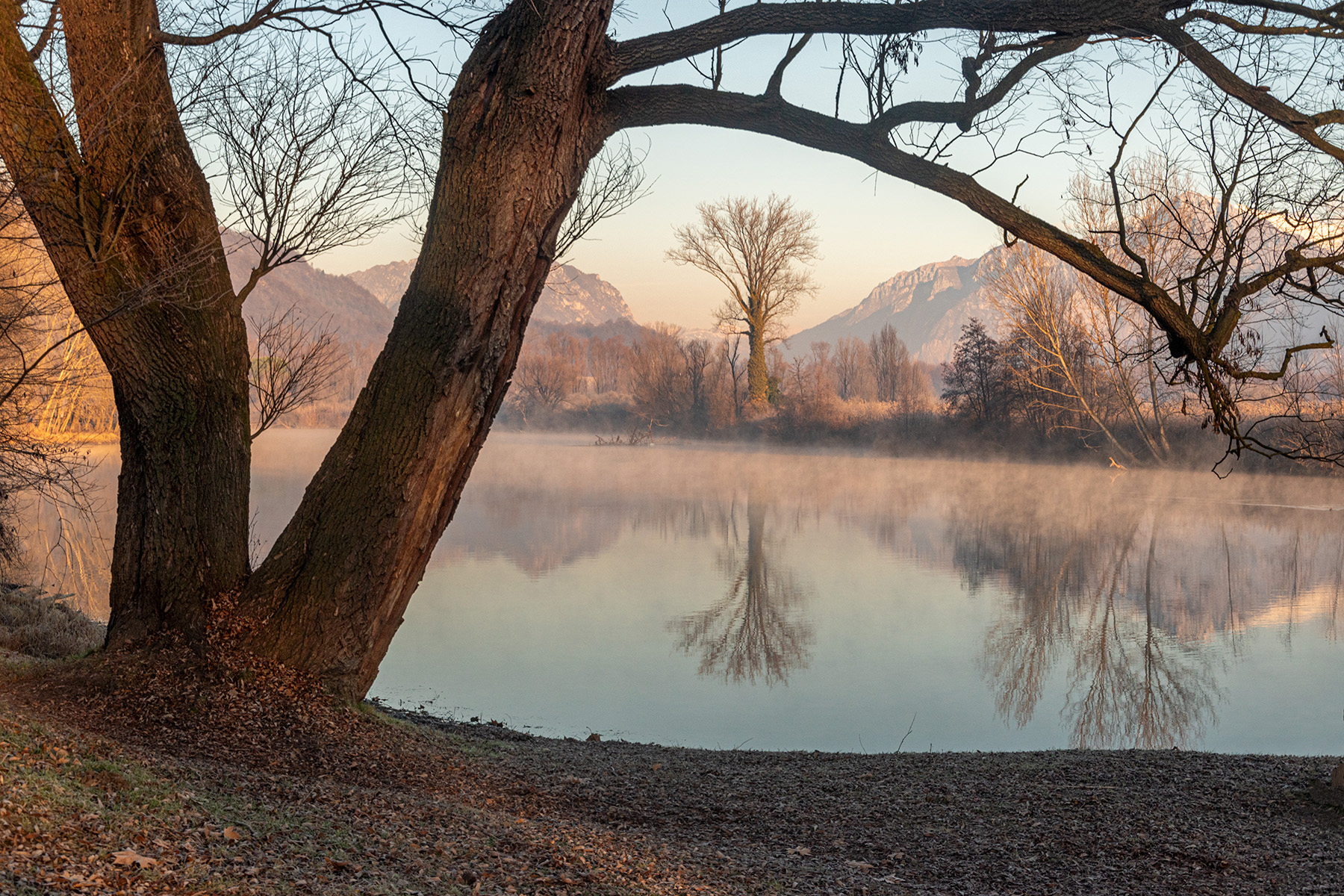 Ottimo scatto molto pensato e molto ben realizzato con l'albero doppio a sinistra che fa da quinta e con il ramo in alto che, insieme al tronco, guidano l'occhio verso il vero soggetto: il fiume. Splendide tonalità dei colori.
