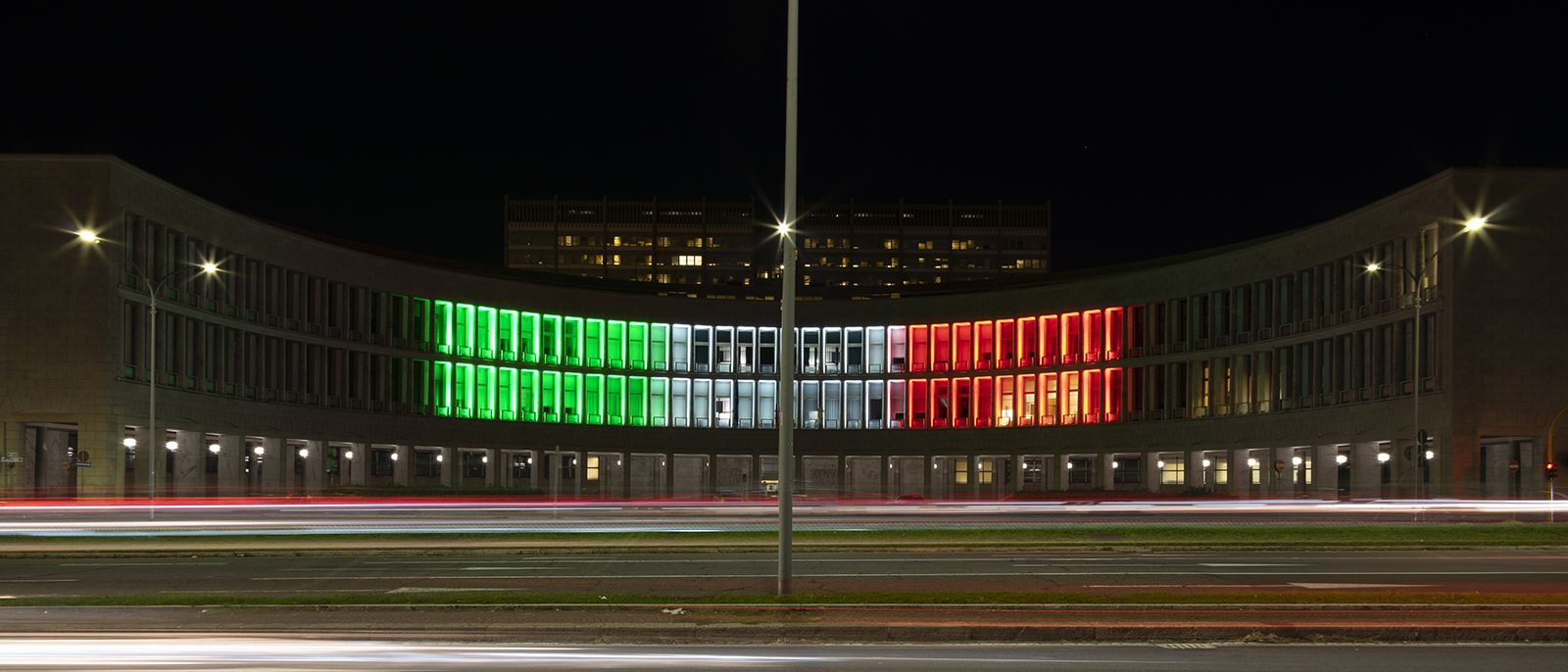 Bella! Il tricolore della facciata è ripreso dalle scie dei fari delle auto accostate al verde dell’erbetta Ok! … le vere frecce tricolori Wink