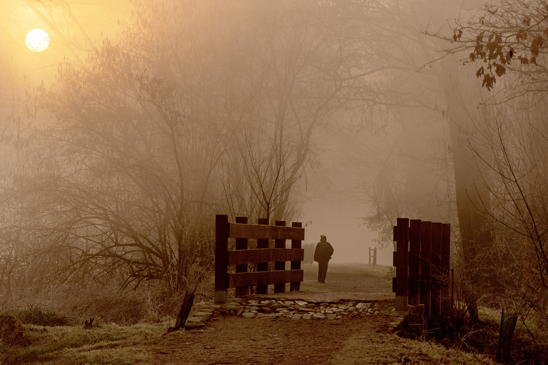 Il sole che buca la nebbia sembra invitare a varcare il cancello per inoltrarsi in uno sfondo impalpabile. Molto bella la figura umana, inserita in un arco naturale di rami, che si inoltra in questo sfondo un po misterioso. Ottima proposta