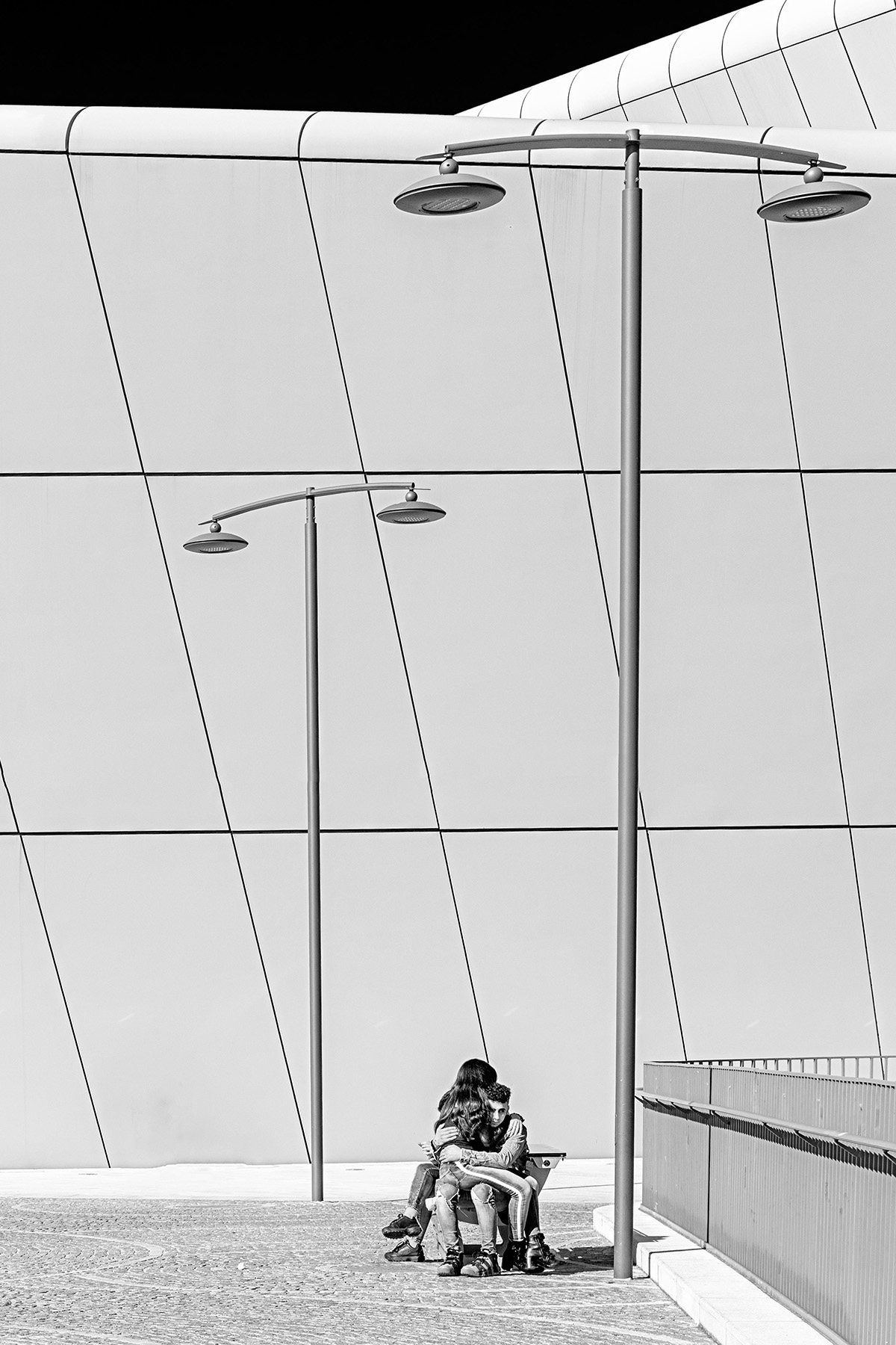 Un tenero abbraccio fra due innamorati in un contesto di rigorose linee architettoniche.