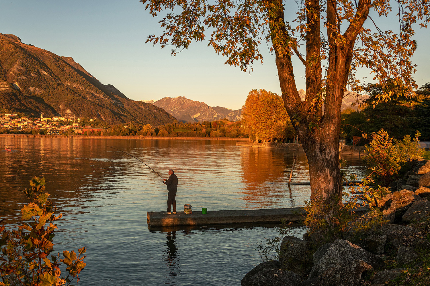 Colori caldi e freddi che si mescolano, un albero a dx e le foglie a sx che oltre a far da quinta danno profondità, un tranquillo pescatore con la visione luminosa del lago, del borgo e delle montagne, il tutto riporta ad una visione riposante e affascinante. Ottima proposta