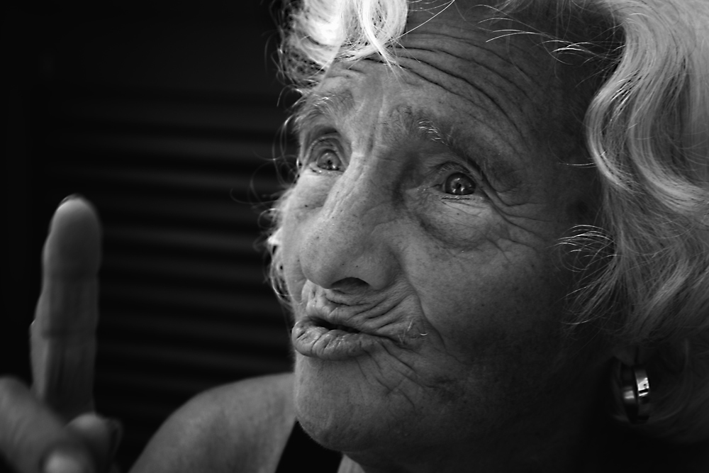 Un primo piano intenso dove hai colto l'anziana signora mentre pronuncia le parole del titolo. Il dito a rinforzare ulteriormente il messaggio.