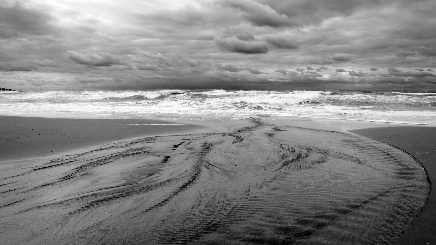 Un BN morbido che lascia respirare l'atmosfera temporalesca ma senza spingere troppo sulle zone scure. Nuvole corpose che portano la tanta attesa pioggia e che non si percepiscono minacciose ma bensì come un dono che la natura offre. Il mare con le sue tumultuose onde candide divide cielo e spiaggia e il rivolo d'acqua in pp disegna linee che conducono lo sguardo lontano
