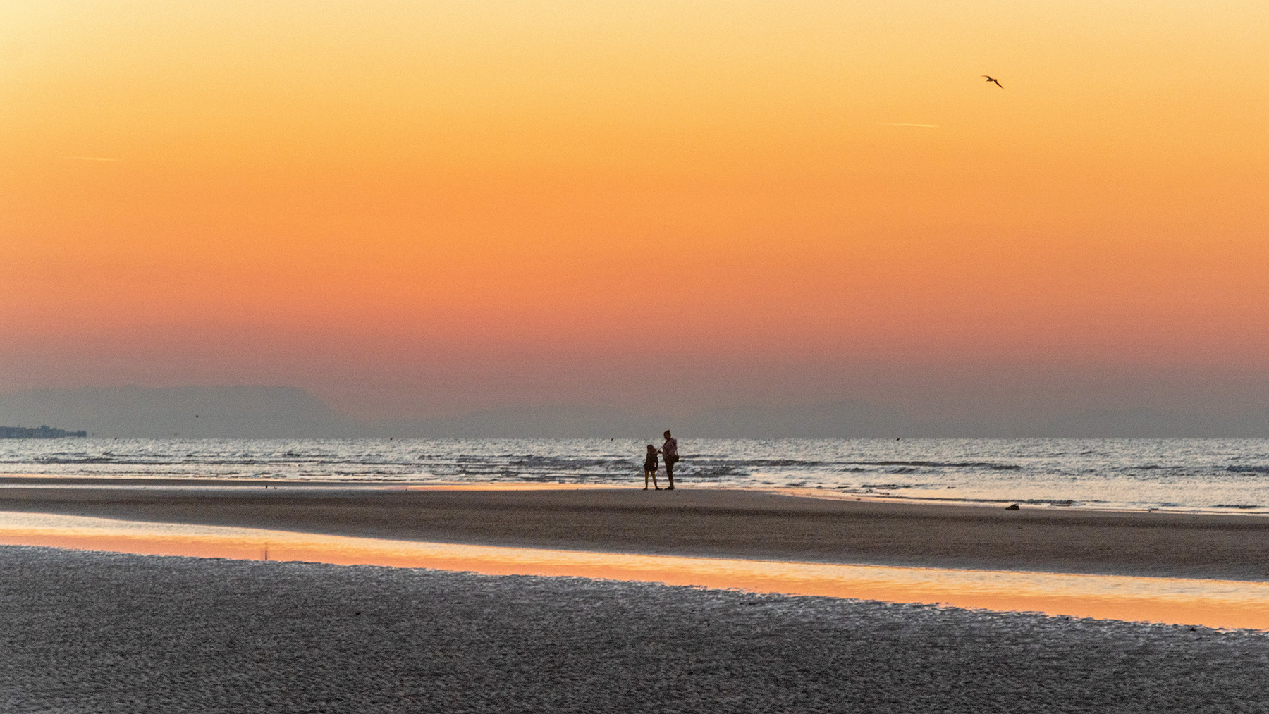 | Una spiaggia quasi deserta in un momento di luce molto intenso anche di calore del colore. La parabola del volatile aggiunge spirito evocativo all'immagine. Mi piace. Ciao, Tiziano |
