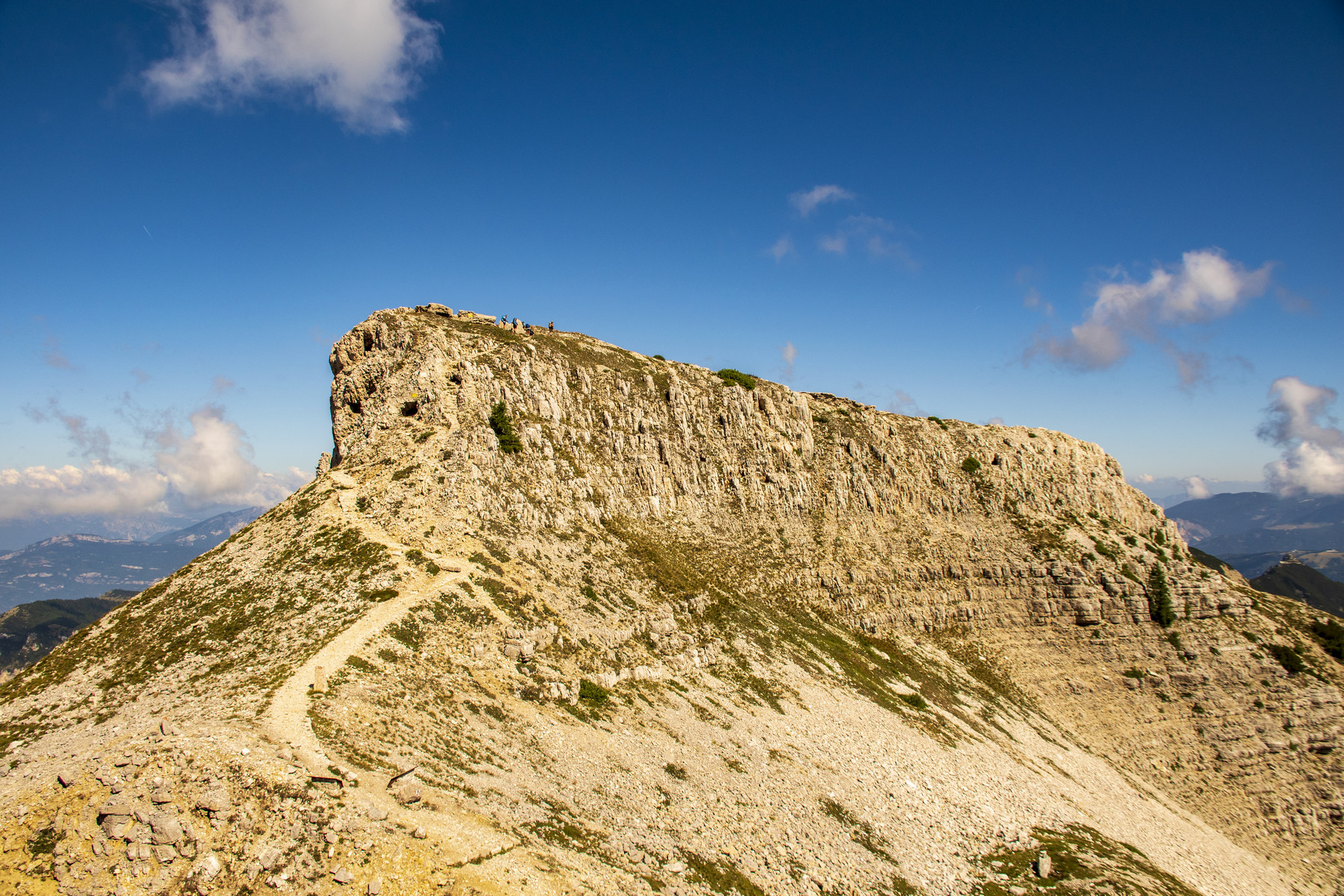 L'occhio viene guidato dal sentiero che porta al costone roccioso per poi perdersi: chissà se sarà agevole salire fin lassù. Le figure umane sulla cresta danno la misura dell'imponenza di questa montagna rocciosa. Le nuvolette ingentiliscono la visione. Forse un maggiore allargamento dell'immagine ne avrebbe giovato dando spazio al contesto ambientale che mi sembra interessante