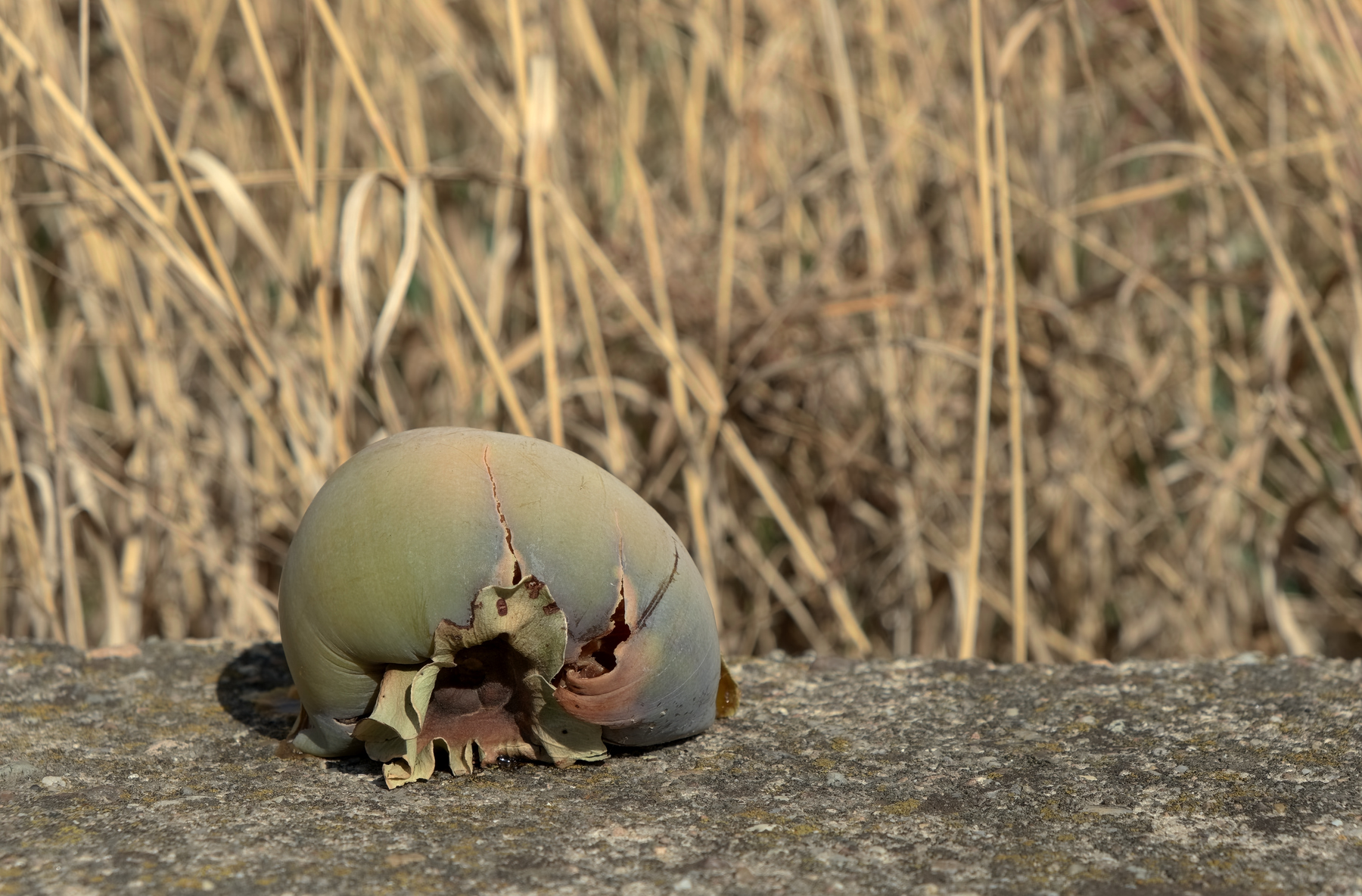 Il soggetto sembrerebbe un caco caduto quando non era ancora sufficientemente maturato. Bello il dettaglio e lo sfondo sfocato che ci parla un po' del contesto ambientale