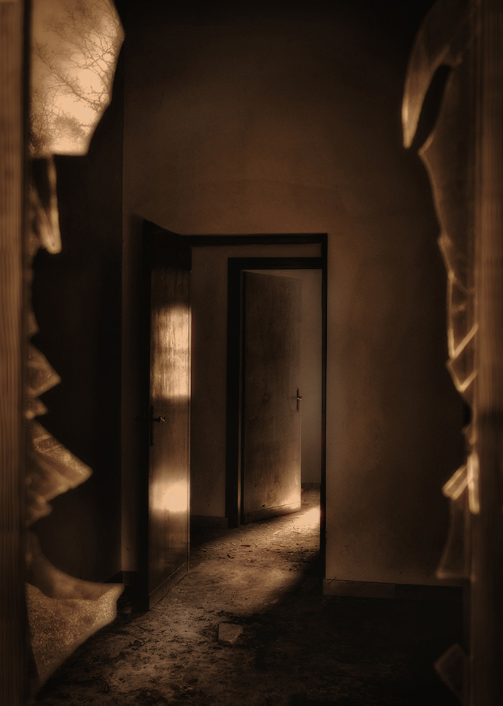 La doppia porta, la cornice di vetri rotti, il viraggio creano un senso di profonda inquietudine.
