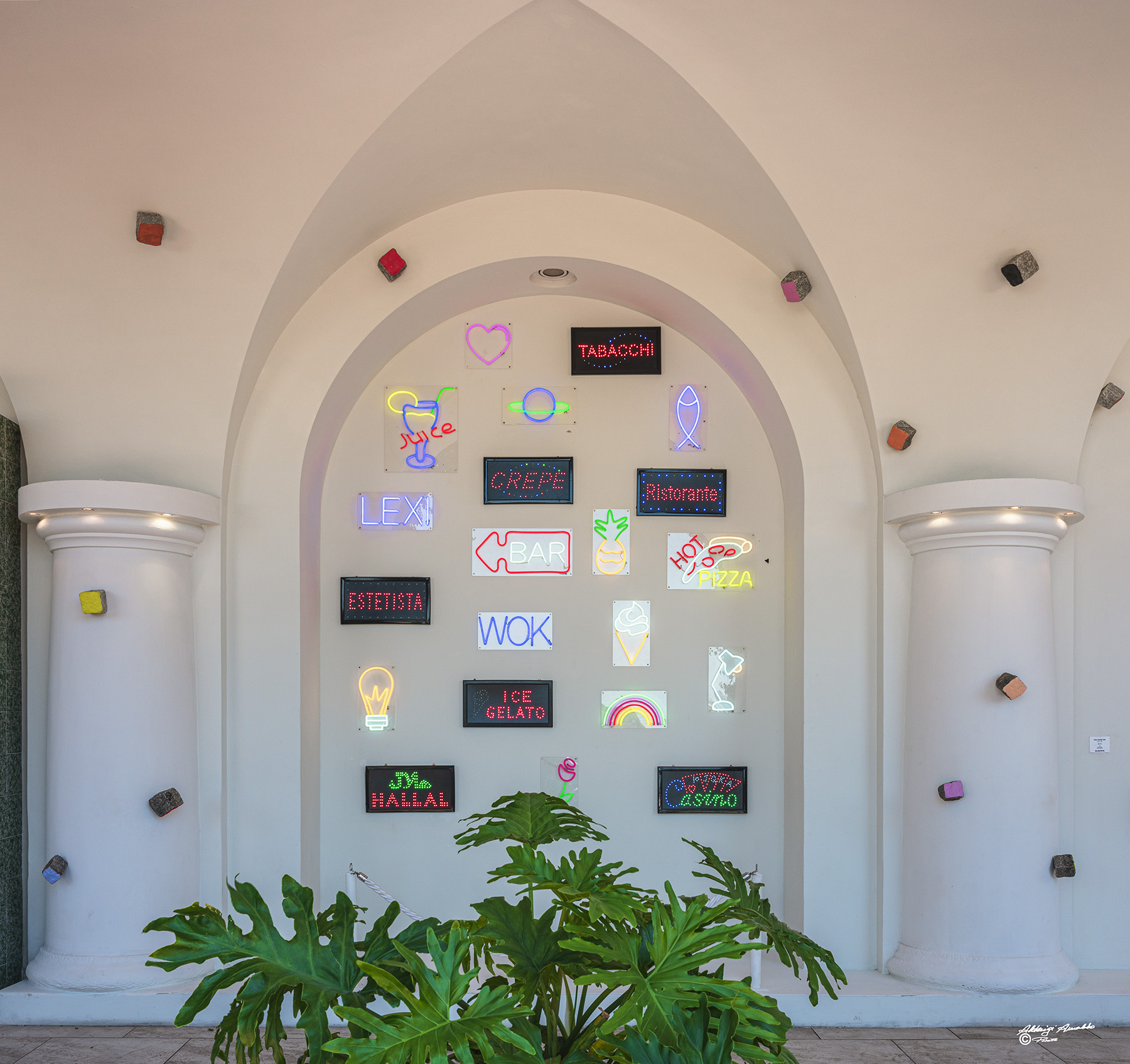 Una bella esposizione di targhette colorate, ben disposte, su parete con due archi: circolare ed acuto, era meglio se non tagliavi il pezzo dell'arco acuto. Mi piace la variazione di colore dal rosa al viola che illumina la parete. Ben colta _________________ Giuseppe |