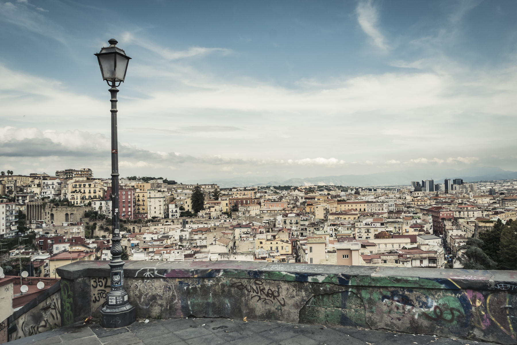 Ciò che attrae di più è il mood dell'immagine, sospesa tra il drammatico e il vintage. Il lampione fornisce l'appiglio visivo principale, ingombrante, ma non invadente. Il muretto è la base da cui partono i piani del paesaggio via via più lontani.