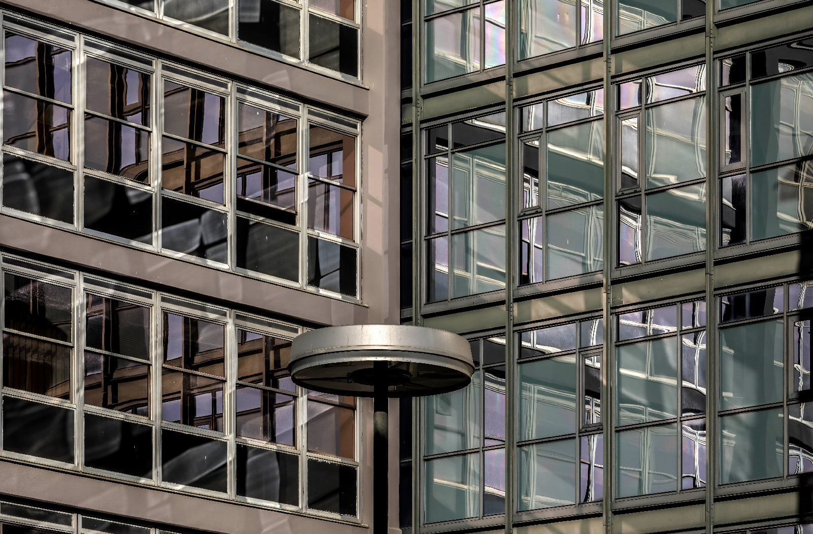 Finestre che si moltiplicano grazie ai riflessi. Il lampione non disturba.