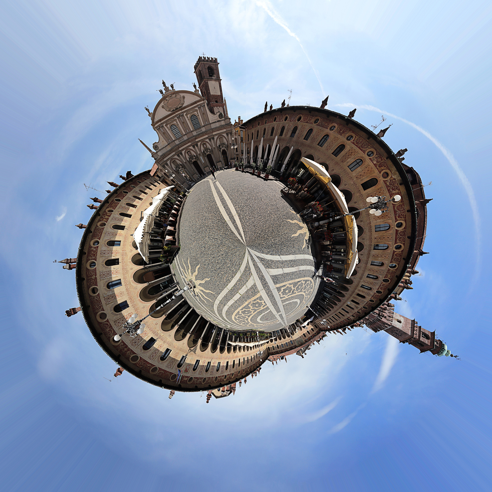 grazie mille a entrambi x i commenti. per ottenere questo scatto mi sono posizionato in centro alla piazza e ruotando su me stesso di 360° ho continuato a fare foto (circa 18). poi in pp ho creato una paronamica + l'iimagine l'ho resa quadrata + applicato filtro "coordinate polari".