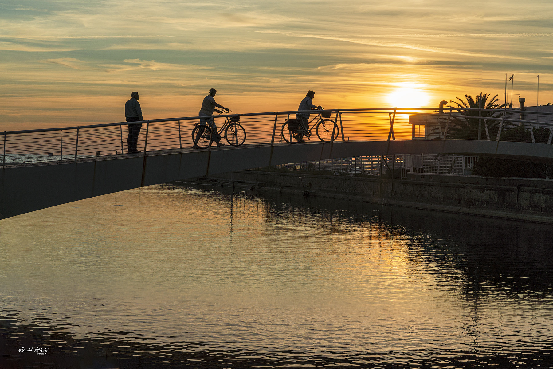 Il momento colto è buono per le luci del tramonto ma anche perchè la scena è animata da ciclisti a mano e da un terzo che sembra trattenersi per godersi l'atmosfera del momento dal punto di vista favorevole.
