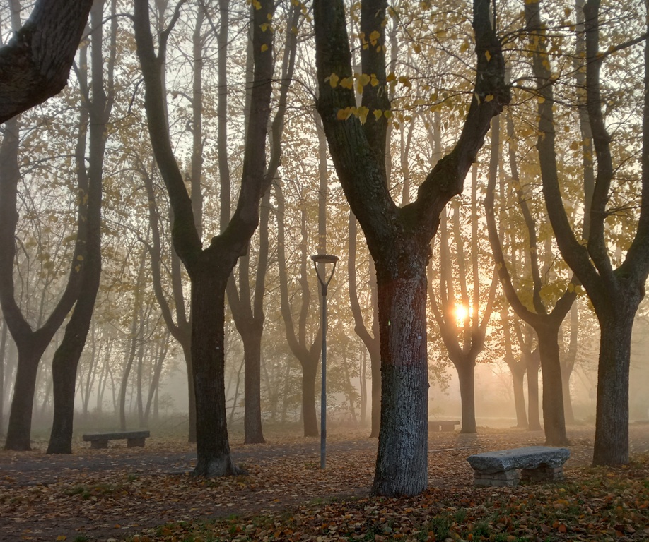 Mi piace molto questo sole filtrato dai rami e dalla lieve foschia che illumina il parco. Bello il ritmo dei tronchi completato dalle due panchine che sembrano guardarsi. Un controluce ben gestito