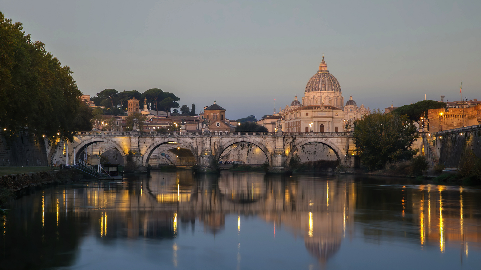 Bello scorcio romano con le prime luci dell'alba ed i scintillii dei lampioni ancora accesi