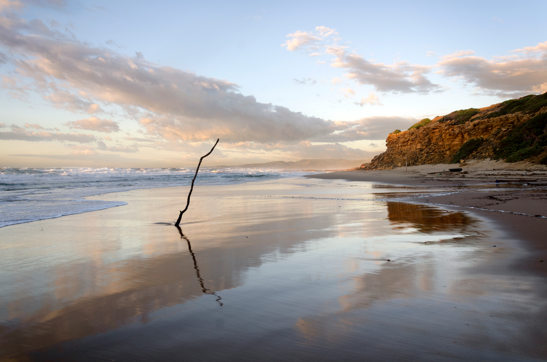 Bella immagine. Mi convince la resa naturale e non forzata delle cromie e la resa plastica della superficie delle acque con il ramo spoglio conficcato nel fondale terragneo-sabbioso del litorale.