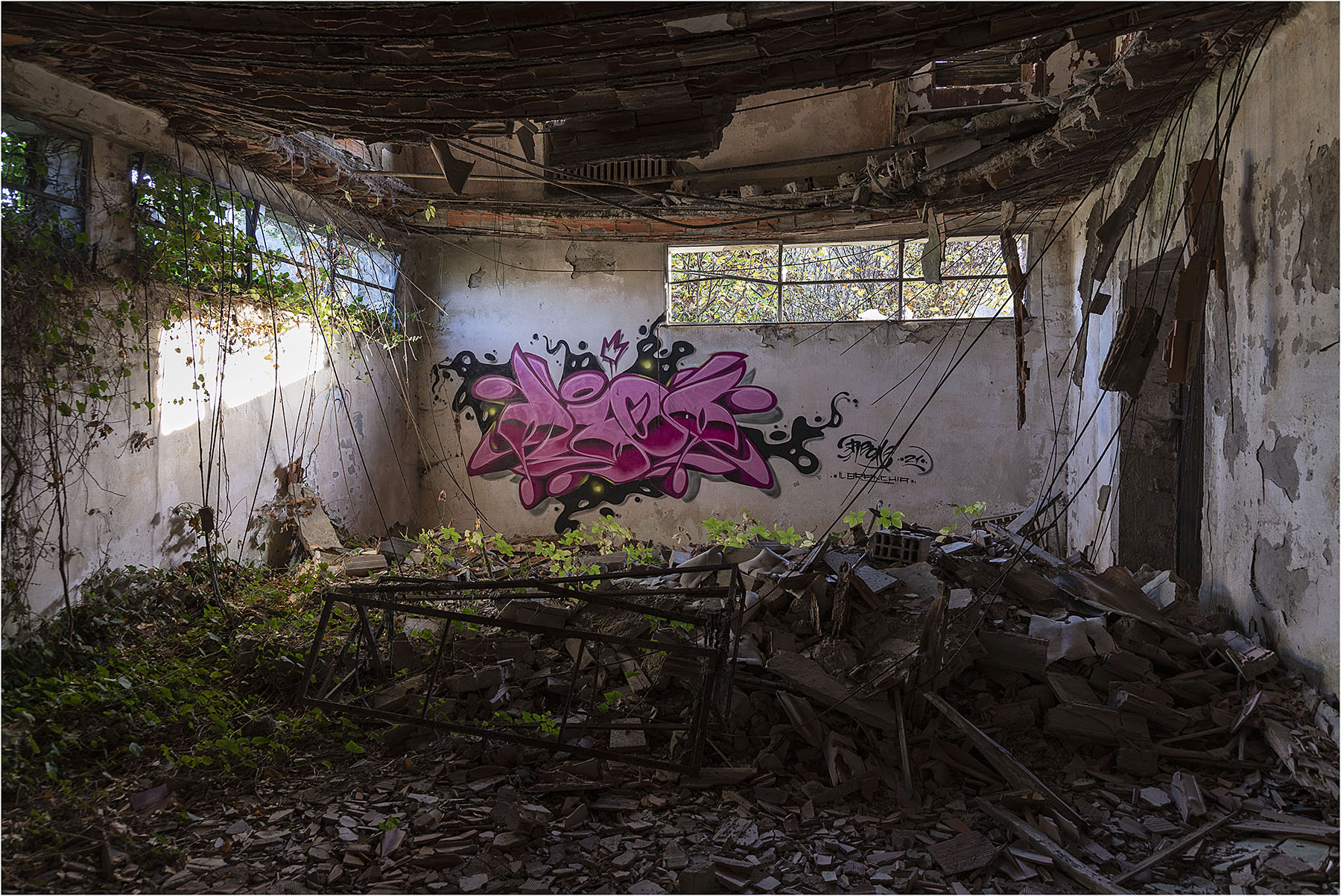 Una presa spiritosa: nello sfacelo totale un graffito in perfette condizioni oltre che a tinte vivaci.