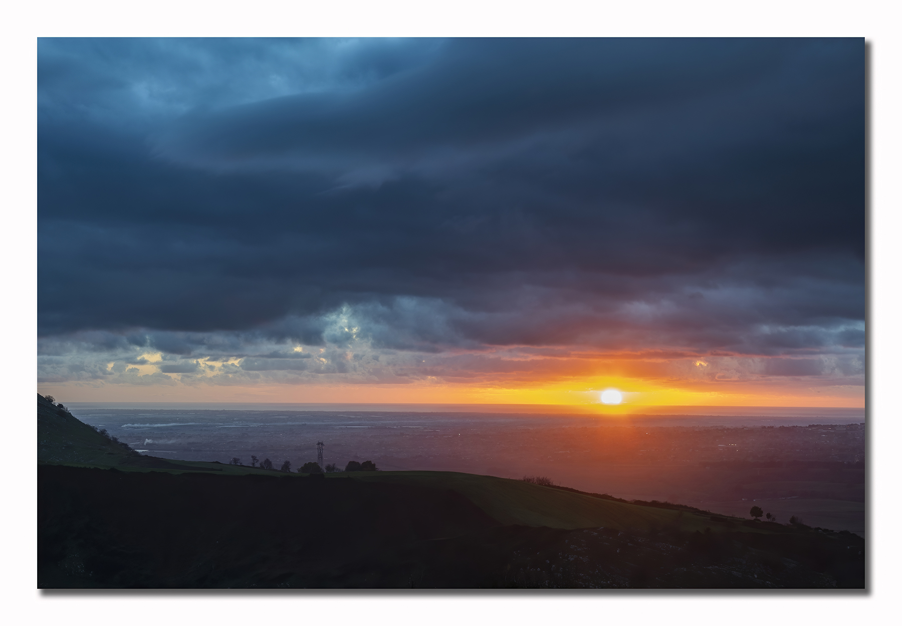 ultimi istanti del tramonto quando il sole ha raggiunto la linea dell'orizzonte. Ancora qualche attimo e la luce qui ancora molto forte avrebbe attenuato la sua potenza ma, conoscendo la tua esperienza , sono convinto che cercavi proprio questo fascio di luce che letteralmente trapassa le corpose nuvole. Sei riuscito anche a tenere leggibile il pp in controluce sparato.