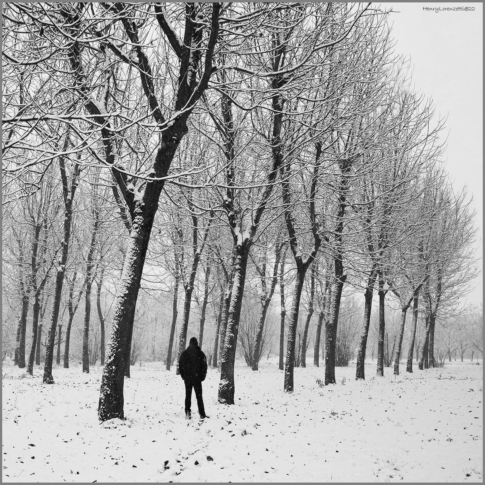 Due passi nella neve e a giudicare dalla postura disinvolta e mani in tasca il soggetto sembra quasi naturalmente a suo agio senza freddo o eccessivo impaccio da vesti invernali.