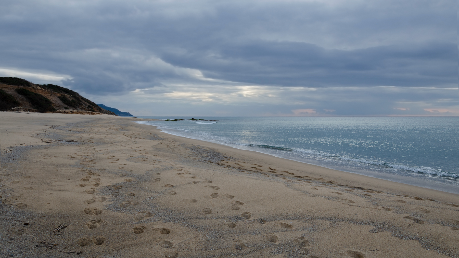 Una spiaggia solitaria trapuntata da orme non umane, un cielo dalle tinte delicate e che sembrano pennellate di un pittore, un mare calmo e dalla bella resa dell'acqua, colline dalle forme interessanti e dai colori che contrastano col resto del frame. Un paesaggio un po melanconico ma che ispira tranquillità. Mi piace e non poco _________________ Giuseppe |