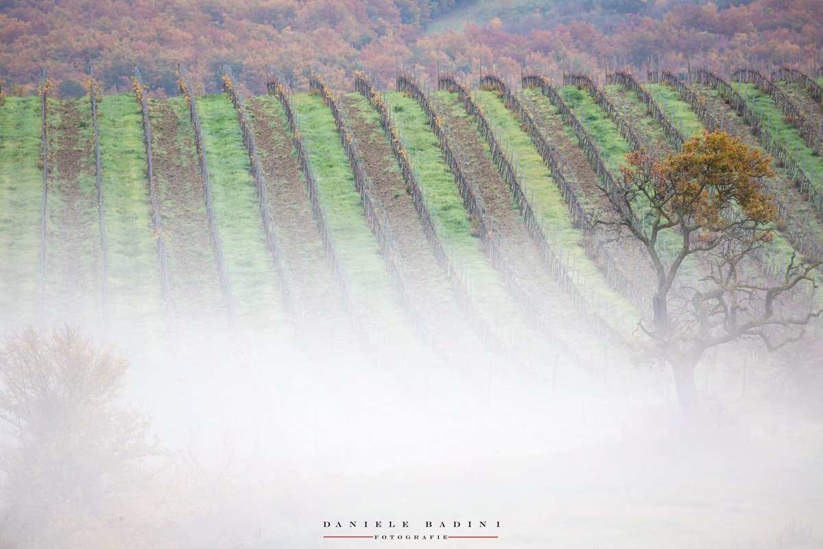 In questo caso particolare la nebbia non aggiunge fascino ma (a mio avviso ovviamente!) disturba la visione dei bei filari con alternanza di colori che avrebbero meritato maggiore evidenza… Buona comunque la composizione