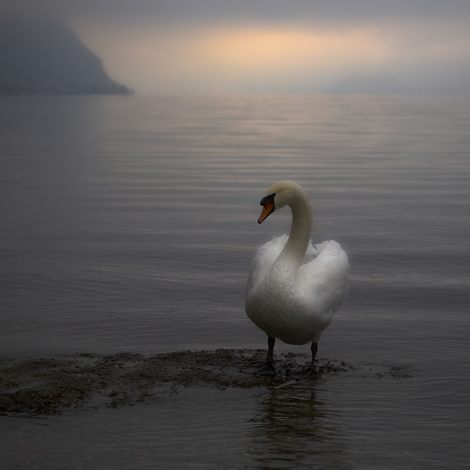 Il cigno è ben posizionato nella composizione e all'atmosfera cupa che lo circonda si contrappone molto bene il caldo chiarore filtrato dalla foschia che arriva dallo sfondo del frame, anche il formato 1:1 è azzeccato.