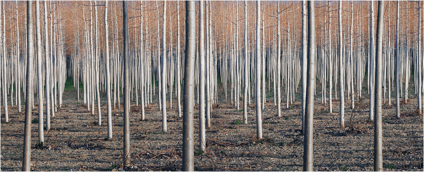 Anche se non perfettamente simmetrica rispetto al tronco centrale, sei riuscito a trovare un PDR che garantisse una visuale ampia ed armonica di quella moltitudine di pioppi e che riesce a far penetrare lo sguardo dell'osservatore fino in profondità. non deve essere stato semplice.