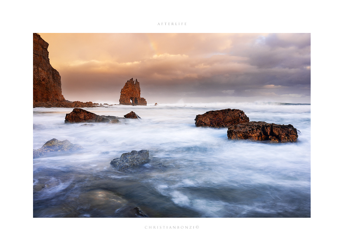 Uno scenario mozzafiato. Ottima la resa dell'acqua in primo piano ed a seguire degli scogli. Il piano sullo sfondo è mirabile con rocce, faraglione che si stagliano su un cielo di tinte intense. Se non vado errato noto anche un'accenno di arcobaleno. Ottima e la inserisco tra i preferiti
